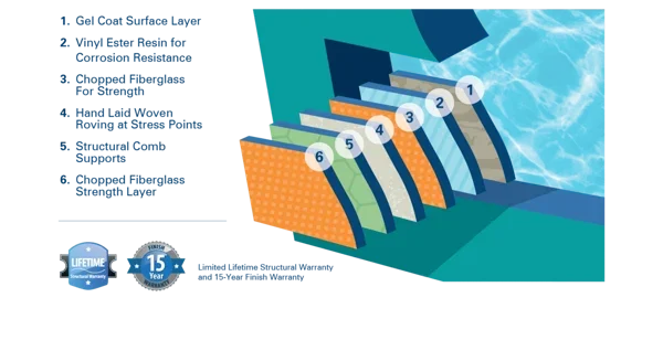 100% vinyl ester resin barrier prevents water penetration into pool shell. This advanced protection system eliminates bubble formation that plagues other manufacturers.